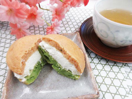 いちごシロップとほうれん草を使った生地で白あんとクリームチーズ入りの生クリームをサンドした洋風どら焼きです
