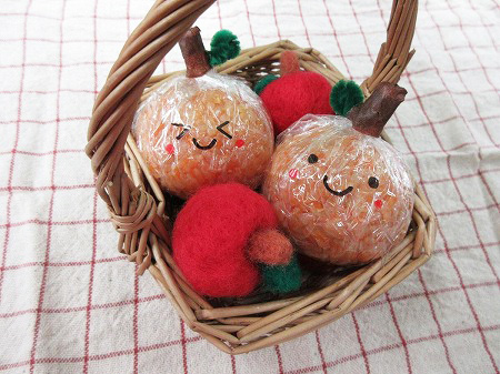 ケチャップライスのおにぎりをリンゴに見立てました。中にはキャンデーチーズが隠れています