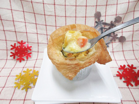 丸く膨らんだパイの下にはかぼちゃ入りのあったかシチューが隠れています